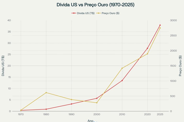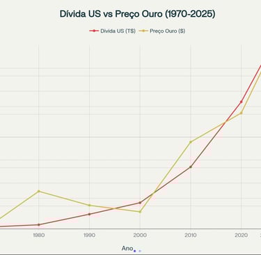 A correlação entre preço do ouro e dívida americana nunca foi tão clara. Em 2025, a dívida dos EUA ronda os $37,9 trilhões, enquanto o ouro cobre apenas 2% deste valor – uma queda brutal face ao passado, quando o ouro sustentava até 40% da dívida federal (ver gráfico abaixo)[6].